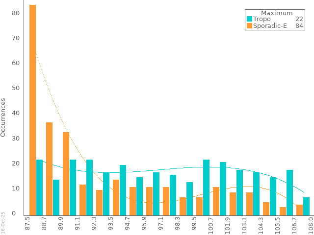 It may look as if there is less reception of Tropospheric signals in the top 'block' between 106.2 and 108.0 MHz. However, it is worth noting that in most European countries, the power levels of stations in this frequency range (especially above 107 MHz) is limited so as to try and avoid causing unwanted interference to aeronautical radio services which occupy the territory above 108 MHz. It is therefore more difficult to catch DX stations above 107 MHz as their power levels are lower and this is most likely why this frequency range appears to have fewer logs than others.
